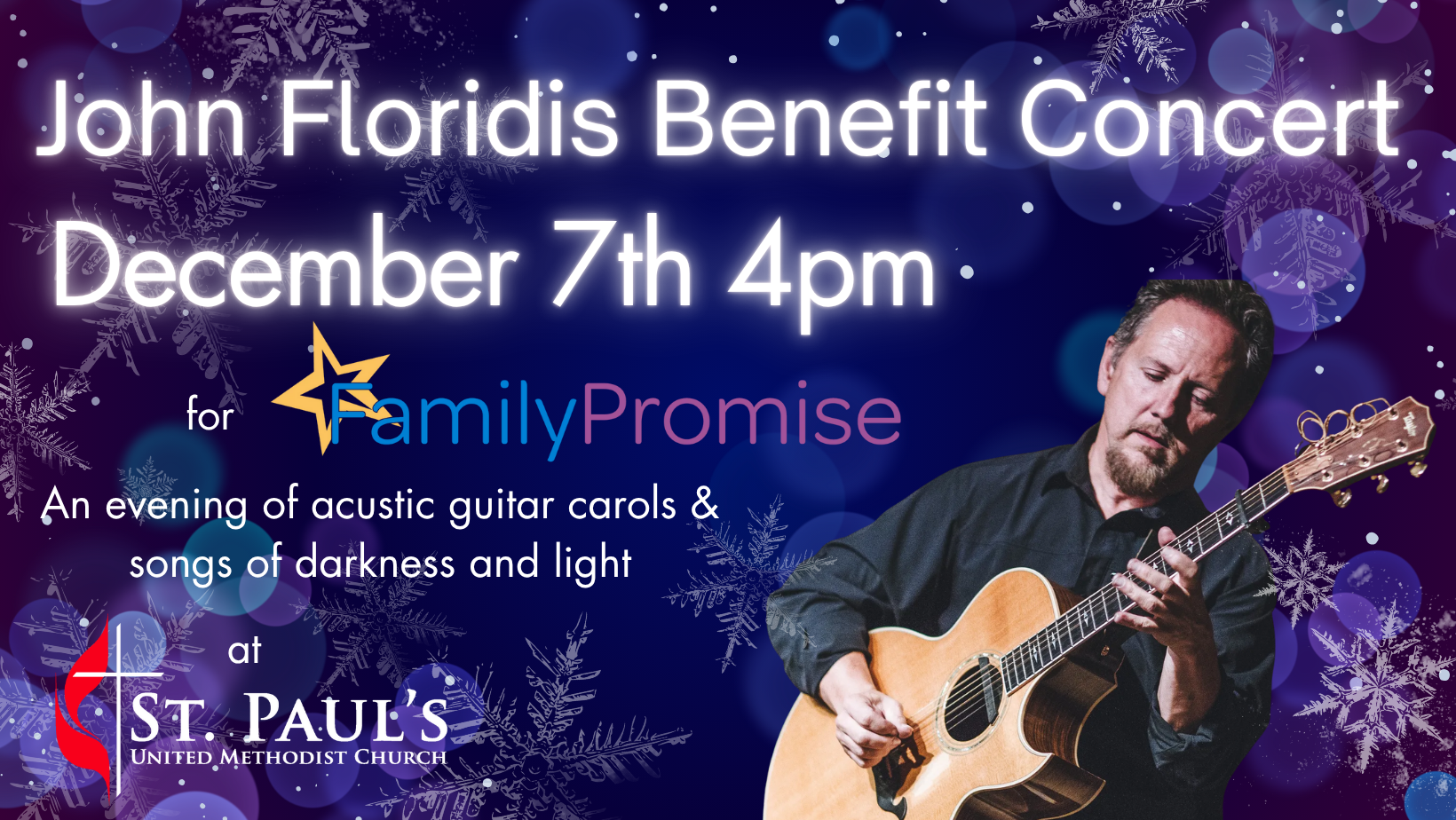 John Floridis returns Dec 7th for Family Promise’s annual benefit concert. Tickets by donation at the door. Concert starts at 4 pm in the sanctuary. Floridis will be joined by special guests Ed Stalling on Percussion and Jennifer Slayden on Cello.